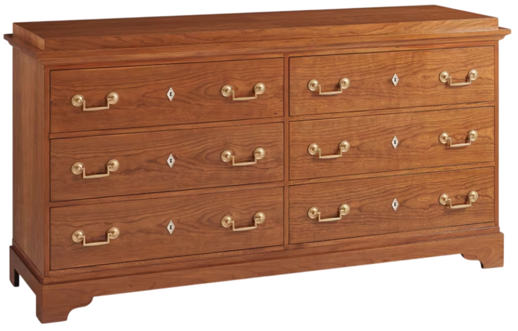 A Biedermeier moment, architectural detailing shines in the six-drawer Viggo dresser fitted with brass handles (in Hampton brass finish) and ivory-finish escutcheons. Beautiful stepped-caddy dresser top and bracket feet. Solid Cherry and veneers.Read More