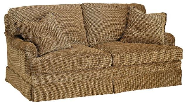 This upholstered sofa features a twin cushion back and seat with two Canadian down throw pillows, between English arms, on a skirted base. Inspired by a Victorian original. Incorporate this piece into your living room decor to give your home an eye-catching update.Read More