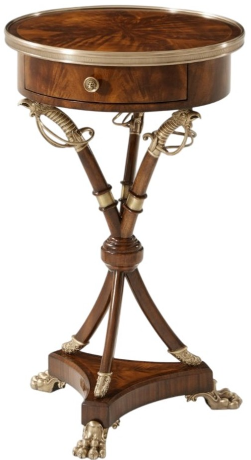 A mahogany lamp table, the circular brass bound top fitted with a frieze drawer on three bound brass hilted sabers mounted on a trefoil platform base with brass lion’s paw feet. Inspired by the 2nd Earl Spencer, appointed 1st Lord of the Admiralty in 1795. The original Regency.Read More