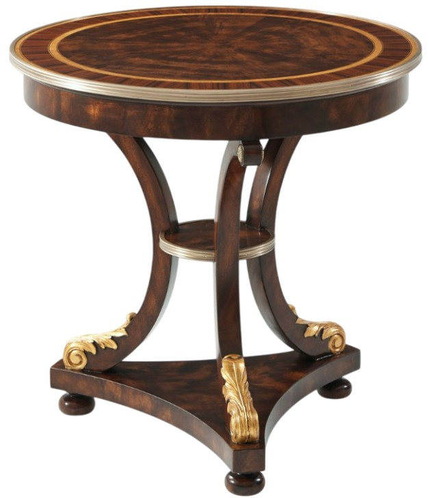 A flame mahogany, Movingue and rosewood banded Gueridon table, the circular top with a brass molded edge, the plain frieze above scrolled legs joined by a brass molded stepped tier and acanthus leaf carved and gilt feet, on a trefoil concave sides base with turned mahogany bun feet.Read More