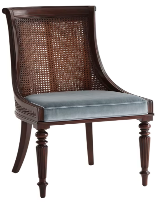 This hand-carved mahogany dining chair features a scoop back with panelled and double caned detailing, offering a rich sense of texture and craftsmanship. An upholstered seat in Dalton Blue Velvet adds comfort, while turned and reeded legs complete its classic, historically inspired design.Read More