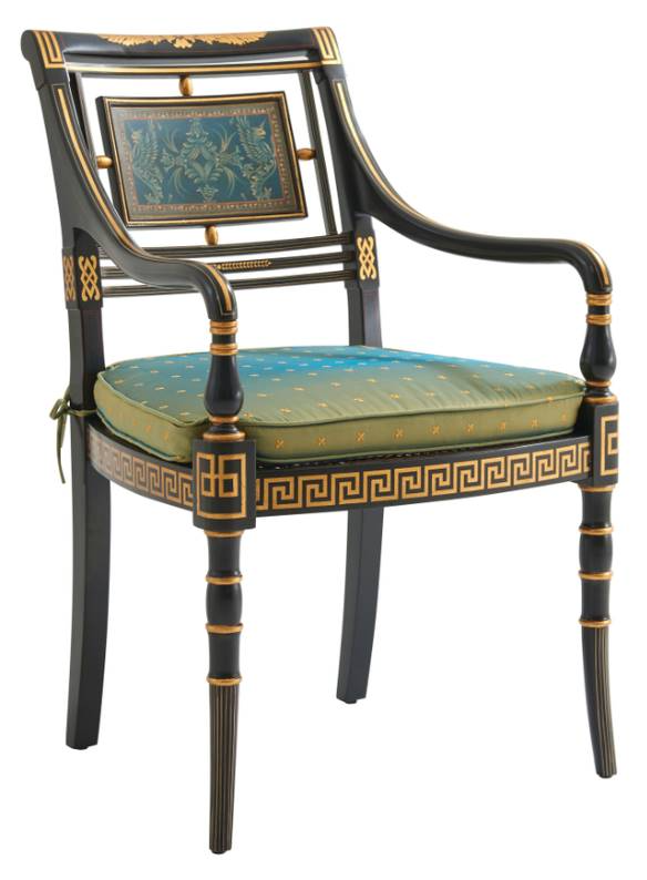 An ebonized and parcel gilt open armchair, the overscrolled back centred by a painted rectangular panel, with a caned and cushion seat, the cushions in blue silk hand-embroidered with coronets, on a Greek key seat rail and on ring turned tapering . The original Regency, circa 1820.Read More