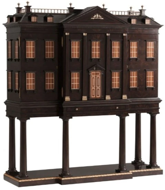 A very finely carved flame mahogany veneered architectural bar cabinet of the Althorp house façade, the upper section with a gabled brass galleried roof with 8 dormers, with a spencer coat of arms pediment, the cabinet with 21 morado and sycamore strung windows, brass detailed pilasters and a door.Read More