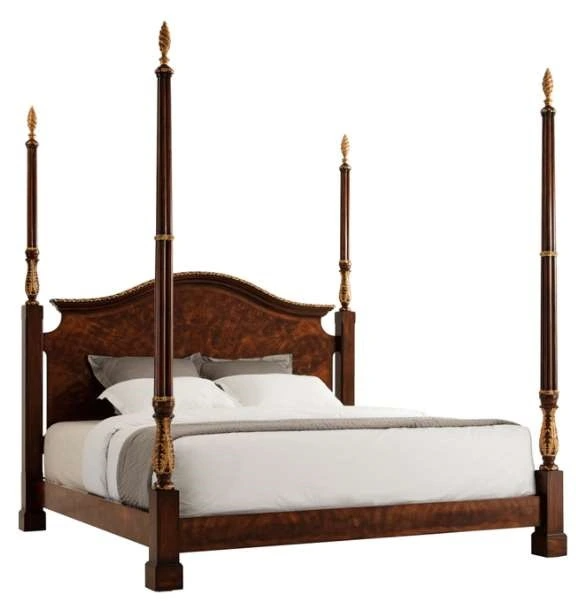 A carved mahogany, flame veneered and parcel gilt four poster king bed, the arched headboard with a carved cornice and finely carved acanthus leaf carved baluster and cluster columns with spiral carved pine cone finials. The original George III, circa 1760 in the India silk room.Read More