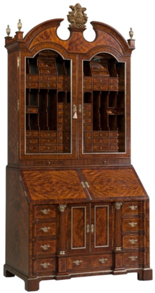 A flame veneered and morado banded bureau cabinet, with an architectural cornice centered by a gilt crest, above two glazed doors enclosing 45 drawers and 19 pigeon holes above two slides, the bureau opening to reveal a leather inset slide and a fitted interior with 8 drawers below enclosing a cabinet and drawer below.Read More