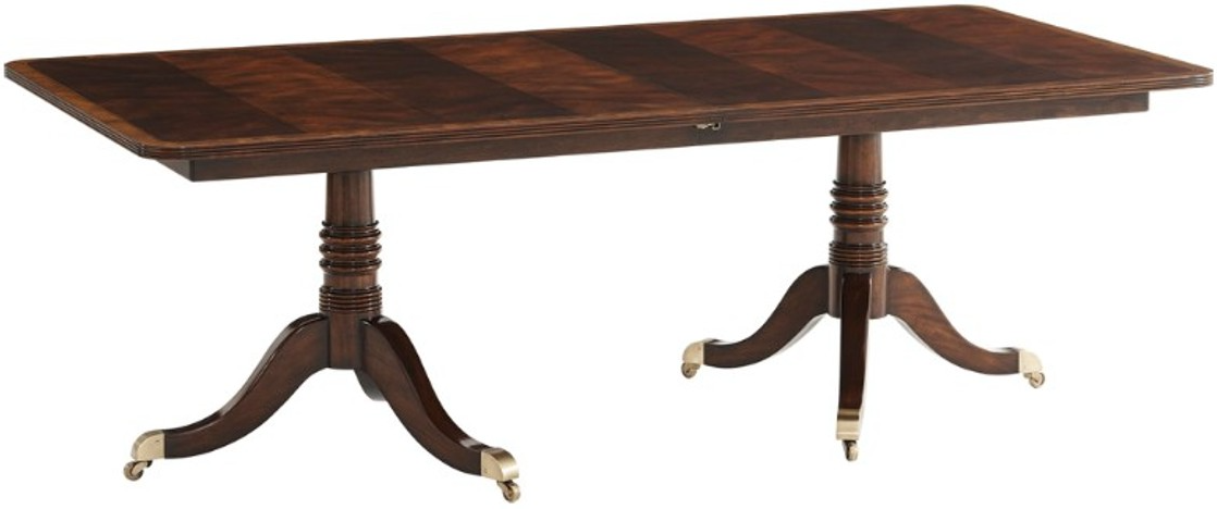 A fine mahogany and flame veneered extending dining table, the rectangular reeded edge top with rounded corners crossbanded in chestnut burl and Morado, with two additional self-storing leaves, above a mahogany apron, on two balusters turned pedestals each issuing four downswept legs terminating in finely leaf cast brass capping.Read More