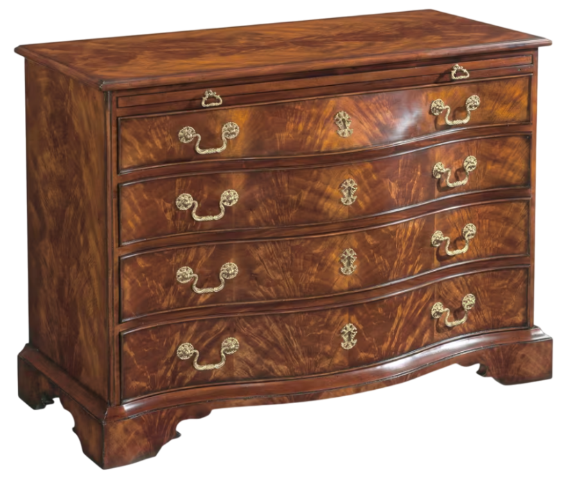 A large mahogany and flame veneered bombé chest of drawers, the rectangular moulded edge top above a brushing slide with four shaped serpentine and graduated drawers below, applied with finely cast brass escutcheons and drop handles, on a plinth base with ogee bracket feet.Read More