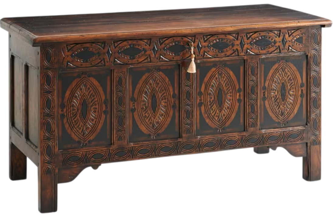 An oak blanket chest, the moulded edge top, above a panelled back and sides, the front carved with ovals and lozenges on stile supports with ogee spandrels. The original English, circa 1650.Read More