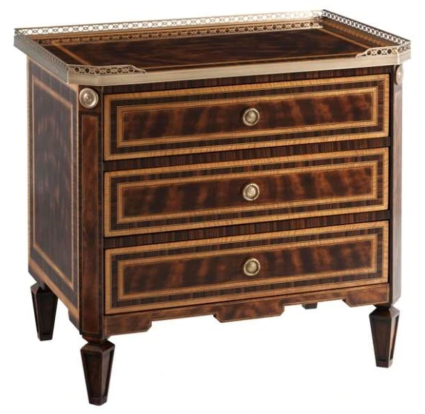 A flame mahogany, Movingue and rosewood banded nightstand, the rectangular top with canted corners and a three quarter brass gallery, three drawers with fine brass handles and on paneled tapering legs.Read More