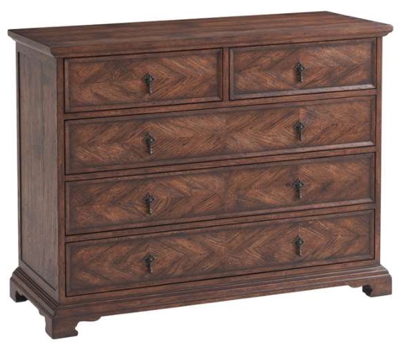 A solid oak and reclaimed oak veneered chest of drawers, the planked top above two short and three long recessed bevel edge drawers with bronze finish drop handles, with recessed panel sides on short bracket feet. Inspired by a George II original at Althorp.Read More