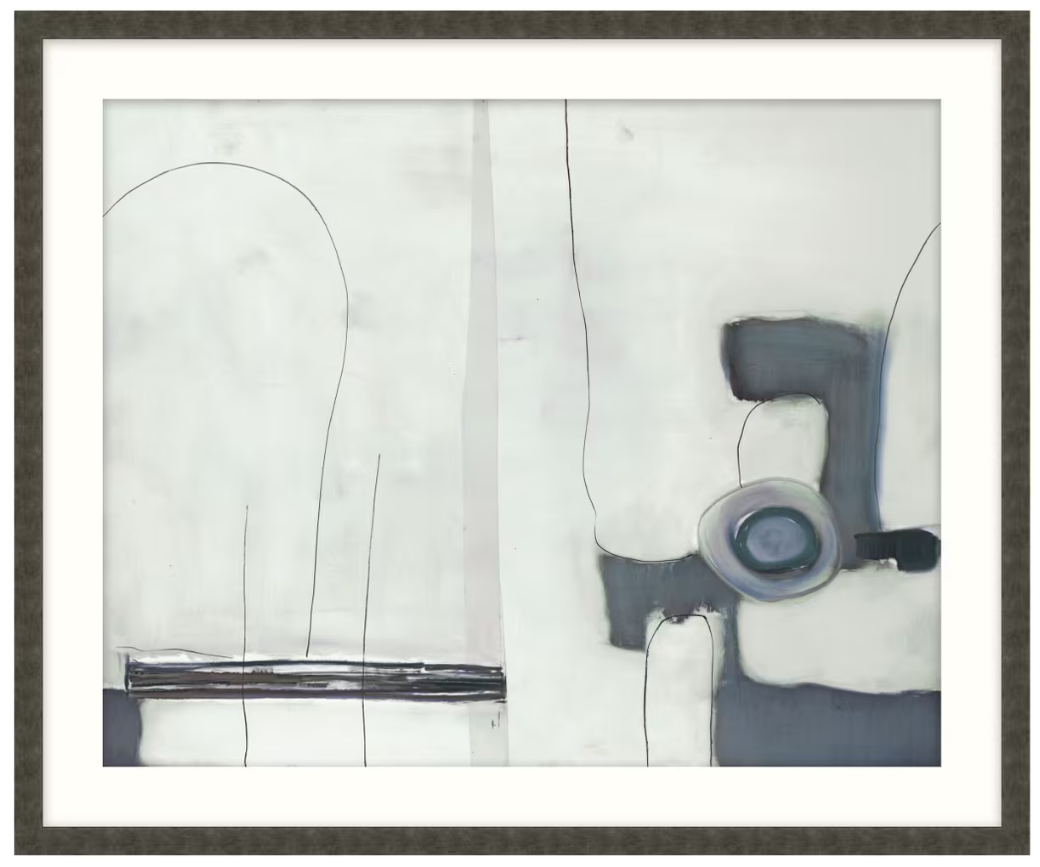 Absent Mind 1 recalls the work of Joan Miró, the renowned Spanish painter, sculptor, and ceramicist who played an integral role in the 20th-century art world, especially in the development of Surrealism. In this work on paper, abstract shapes and random contour lines offer a unique visual language. A dual-picture plane separated by an implied line offers a contrasting balance between a weightier composition on the right with a minimalist feel on the left. The duality is complemented by an understated color scheme featuring a bone background wash overlayered by heavy brushstrokes in slate, midnight blue, and charcoal. Delicate contour lines add a light touch to the composition. A gracefully balanced composition on textured paper, Absent Mind 1 is a striking addition to ART by TA.