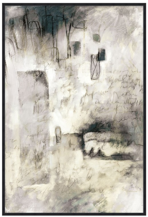 Displaced Scribbles 1 is a pensive, dreamlike work in the style of the Lyrical Abstraction Movement of the mid-20th century. Fluid, abstract forms move carefully across the canvas as scrawlings take the shape of written word. An entrance into the inner mind, Displaced Scribbles 1 is an accomplished piece in a dreamy palette of dark slate grey, bone, linen, and light grey. Enchanting and poetic, Displaced Scribbles 1 becomes a window to the self in this beautiful addition to ART by TA.