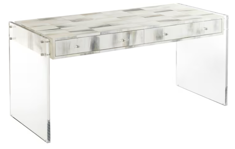 A hand-painted faux horn tiled top defines this sleek desk, featuring two frieze drawers for functionality. Acrylic baton pulls with stainless steel collars complement the clear acrylic end supports, enhanced by stainless steel accents for a polished, modern aesthetic.Read More