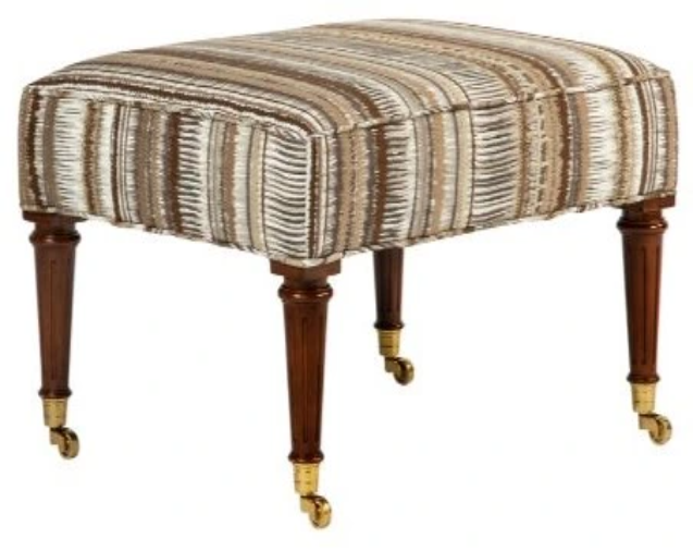 Boxed-upholstered seat ottoman set on turned and fluted tapering legs with brass cappings and casters. Pairs brilliantly with an easy chair, but indispensable throughout the home, wherever extra seating is required or desired.Read More