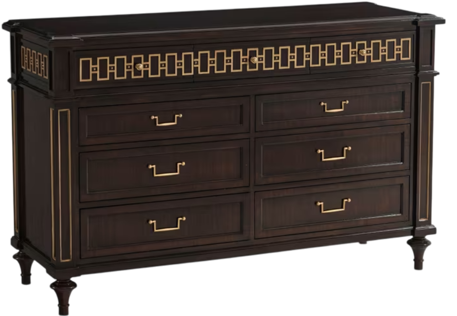 There’s a not-so-quiet dignity to the McCombs Dresser with three fretwork relief frieze drawers, and six generously sized paneled drawers with Hampton finish brass handles below. A chamfered-edge dresser top and turned tapered legs balance details from top to bottom.Read More
