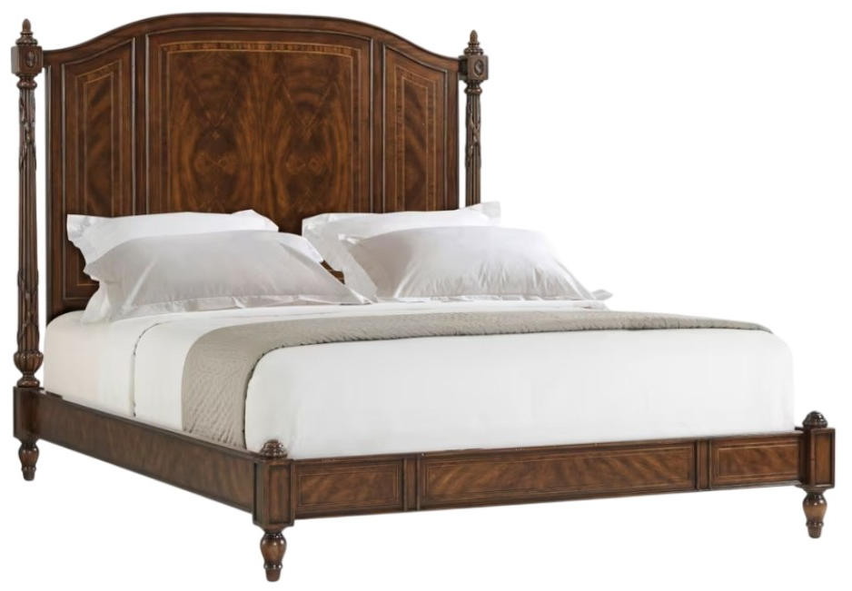 A cerejeira veneered and crossbanded queen bed, the arched headboard of three crossbanded panels flanked by bound reeded carved columns, with a panelled low footboard, on turned tapering legs. Inspired by a 19th century French original.Read More