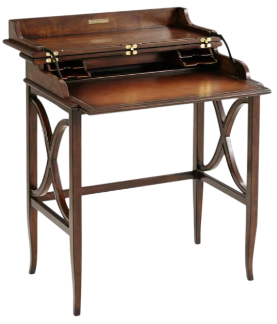 A cerejeira veneered and mahogany campaign desk, the circular crossbanded moulded edge top hinged and folding open to reveal an interior with pigeon holes and a leather writing surface above square tapering and splayed legs joined by wavy 'X' stretcher to each side. Inspired by a 20th century French original.Read More