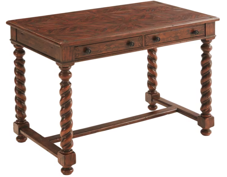 An antiqued wood writing desk featuring two frieze drawers and barley twist turned legs joined by stretchers. Inspired by a 17th-century original, it combines historical charm with practical function. Customizable through Theodore Alexander’s Castle Bromwich collection for a timeless, tailored workspace.Read More