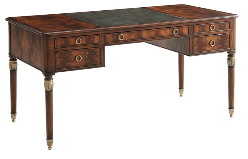 This writing desk features a flame veneered and mahogany frame with a rectangular leather inset top. Five drawers surround the central kneehole, offering both storage and symmetry. Turned tapering legs with brass leaf mounts complete the elegant, historically inspired design.Read More