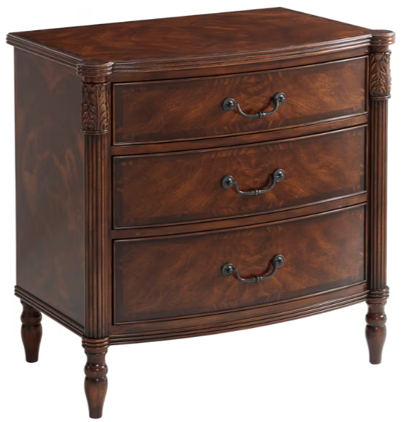 A mahogany and flame veneered nightstand, the reeded edge bowfront top with protruding corners with leaf carved and reeded uprights, with three graduated drawers with verdigris brass handles, raised on turned legs.Read More