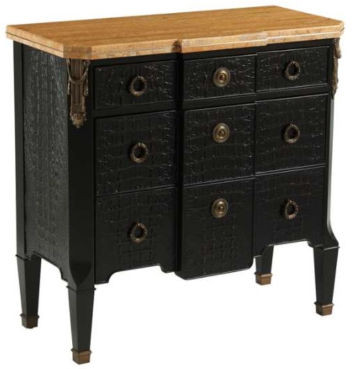 A small ebonised and Kalahari chest of drawers, the Sahara marble top with brass inlaid edges, above three drawers with brass handles, the canted angles with brass column capitals above square tapering legs. The original Empire.Read More