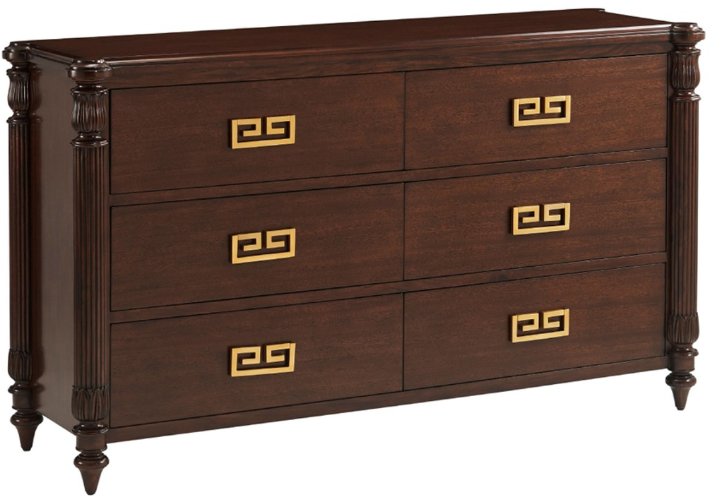 A mix of personalities, Duane combines chic French Directoire fluted legs with gilt petal details. Recessed Greek key brass drawer pulls embellish modest wood drawer faces. Shown with gray marble stone top.Read More