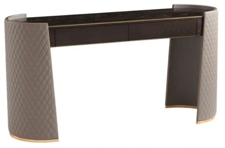 A gallery bronze finish crown oak veneer dressing table, the rectangular top with brass finish molding details and two frieze drawers, the rounded ends with diamond quilted leather wrapped clamped crescent end supports and brass finish bases.Read More