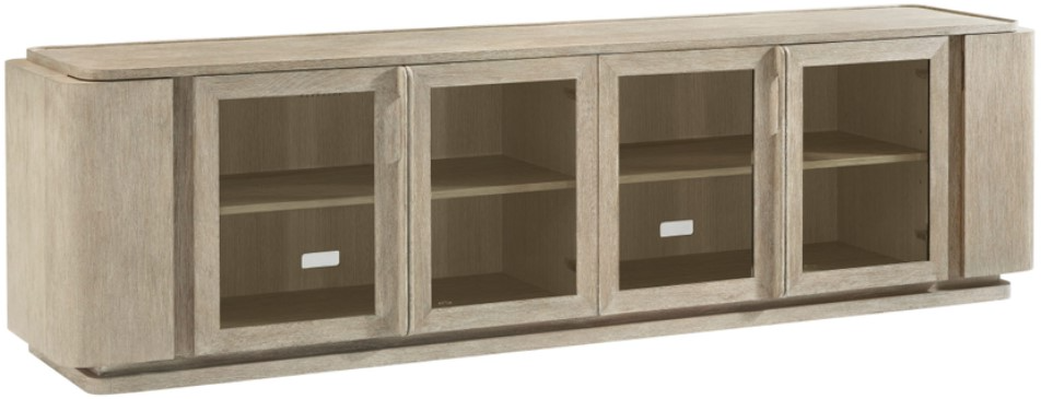 This extra long and low 100" x 28" media console boasts a solid Oak and veneer construction and rests on a plinth base. Hidden on the ends are curved doors that conceal 2 small shelves to store away small items.Read More