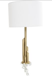 Sleek gold accent lamp highlights asymmetrical posts and a round glass base, creating a beautiful silhouette that will stand out in any room. Wipe clean with a dry cloth. Gold table lamp is constructed with a molded metal body attached to a glass base, with a detachable fabric shade at the top.Read More