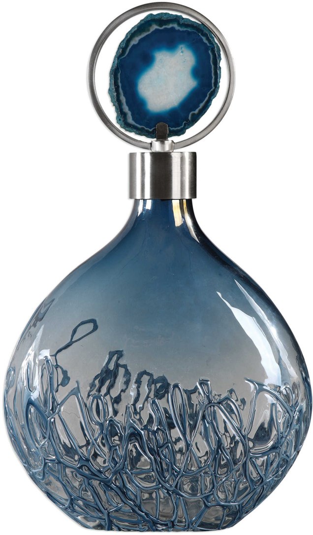 Sky blue iridescent glass bottle with blue sugar spun accents and brushed nickel plated removable lid with blue agate stone displayed in the center of the iron circle.Read More
