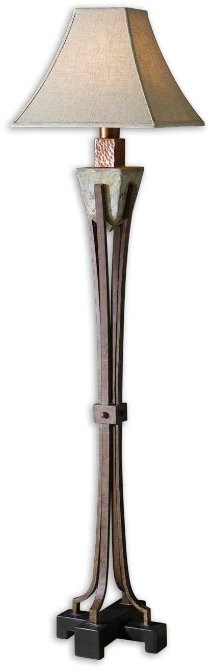 Hand carved slate accented with hammered metal details finished in a warm copper, accented with Tuscan crackled details and a matte black foot. The square bell shade is a weather resistant, oatmeal linen fabric with natural slubbing. For indoor/outdoor use. The sleek and stylish design of this lamp will bring an unique look and feel to any space.