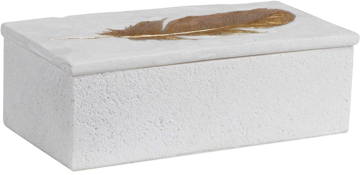 Decorative Box Has An Aged White Stone Look With An Etched Gold Leaf Feather Accent And Lift-off Lid.