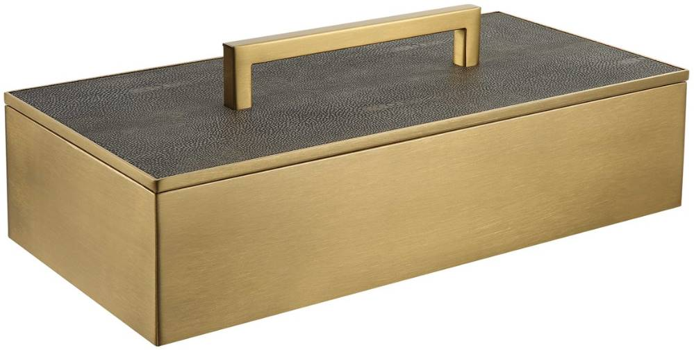 A classic silhouette with modern touches, this metal box is finished in a classic brass and covered with a lift-off lid finished in an elegant gray faux shagreen with brass handle.Read More