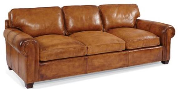 The sofa is shown in leather Sauvage S221 Bark and antique walnut finish.